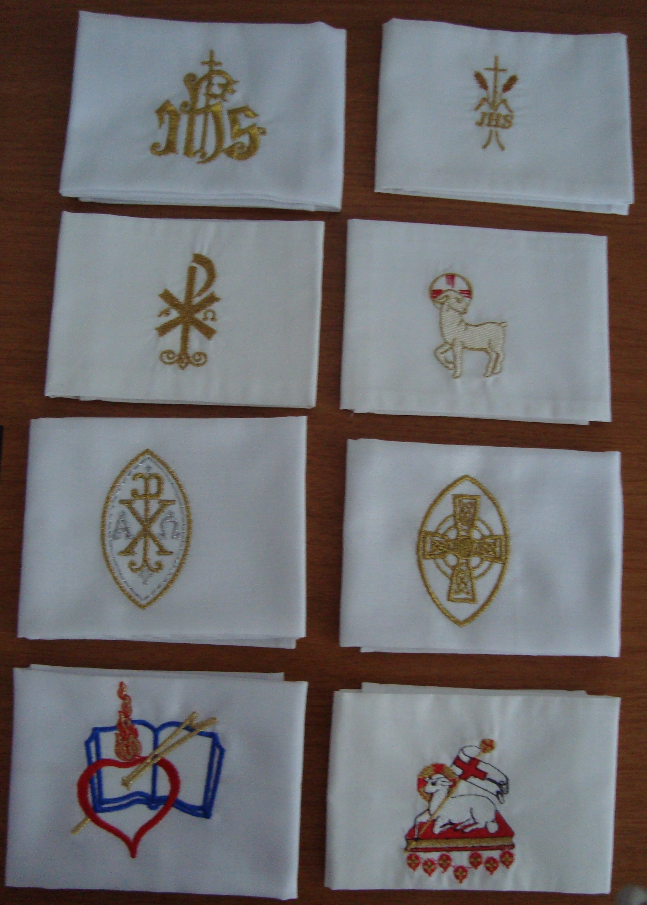 Confeccionados en lino blanco. Bordado a maquina con diferentes imágenes litúrgicas. Tamaño 26 cm. x 36 cm.